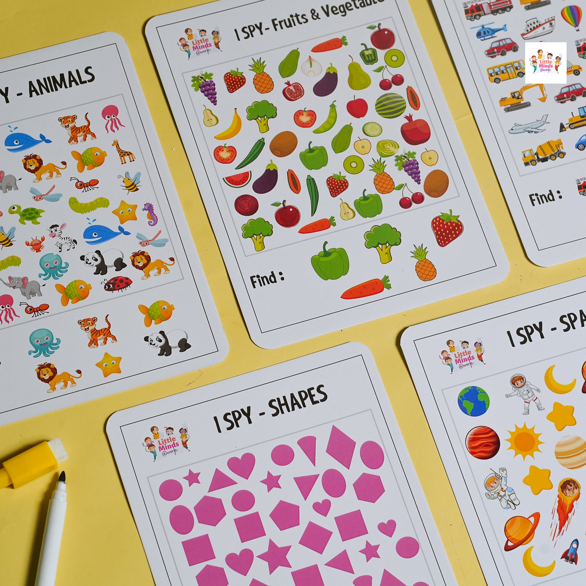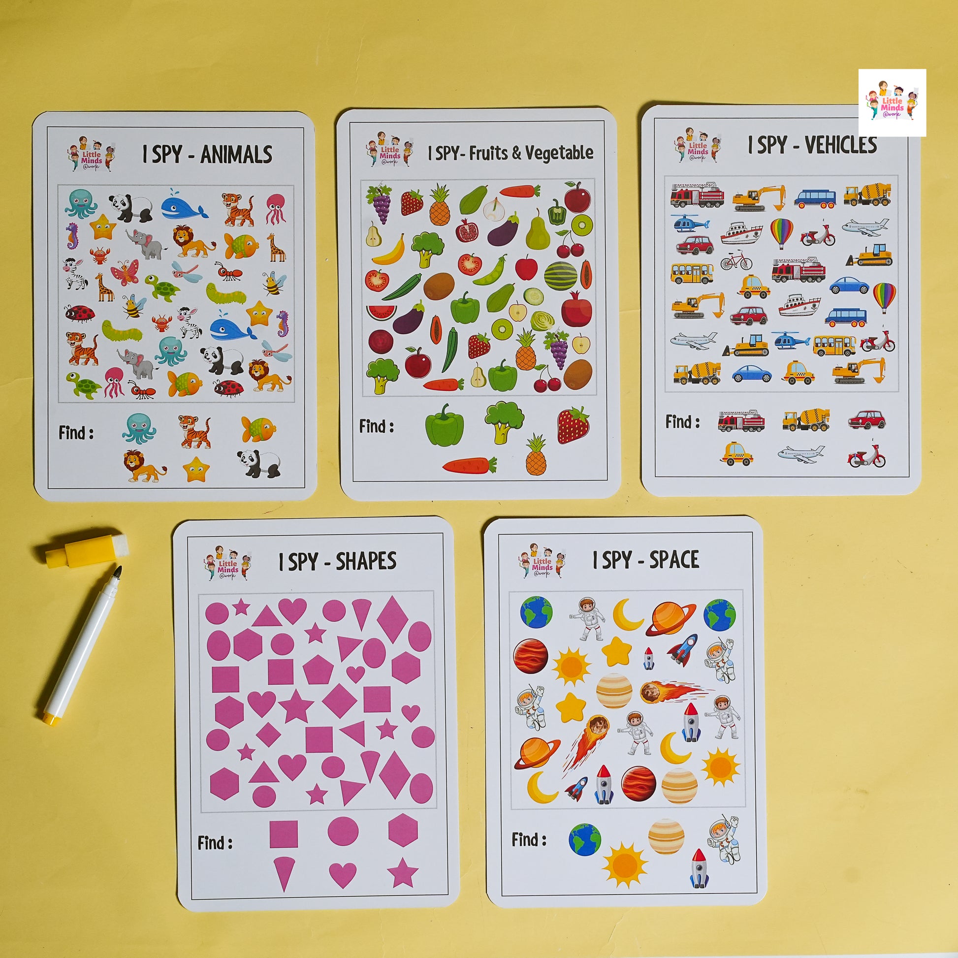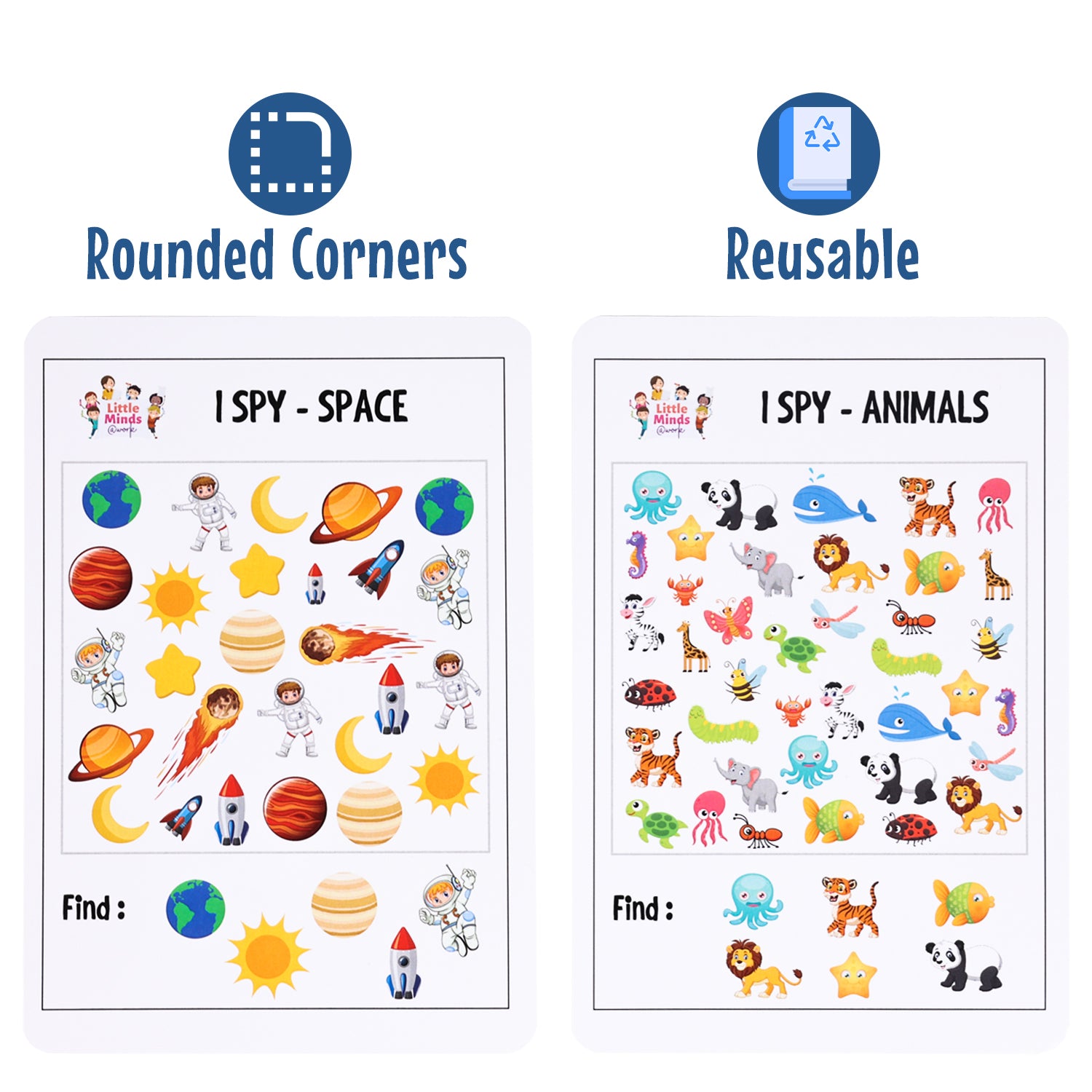 I Spy activity sheets includes 5 reusable, non-tearable worksheets designed to keep children engaged and entertained.