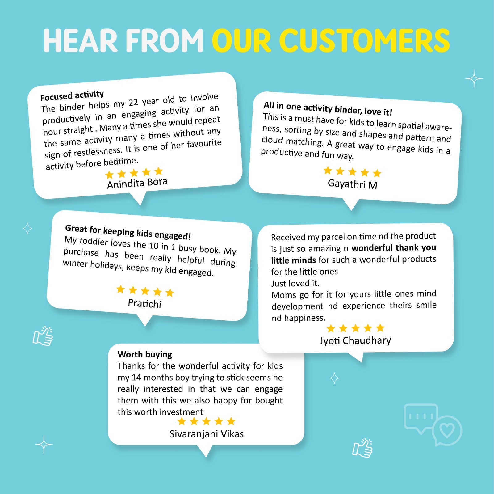My son liked it much😍👌🏻 veryso much interactive n engaging for toddlers. I feel really pround n happy about my decision of purchase littleminds busy binders. I can successfully reduced my sons mobile obsession upto 70%. Thank you so much.