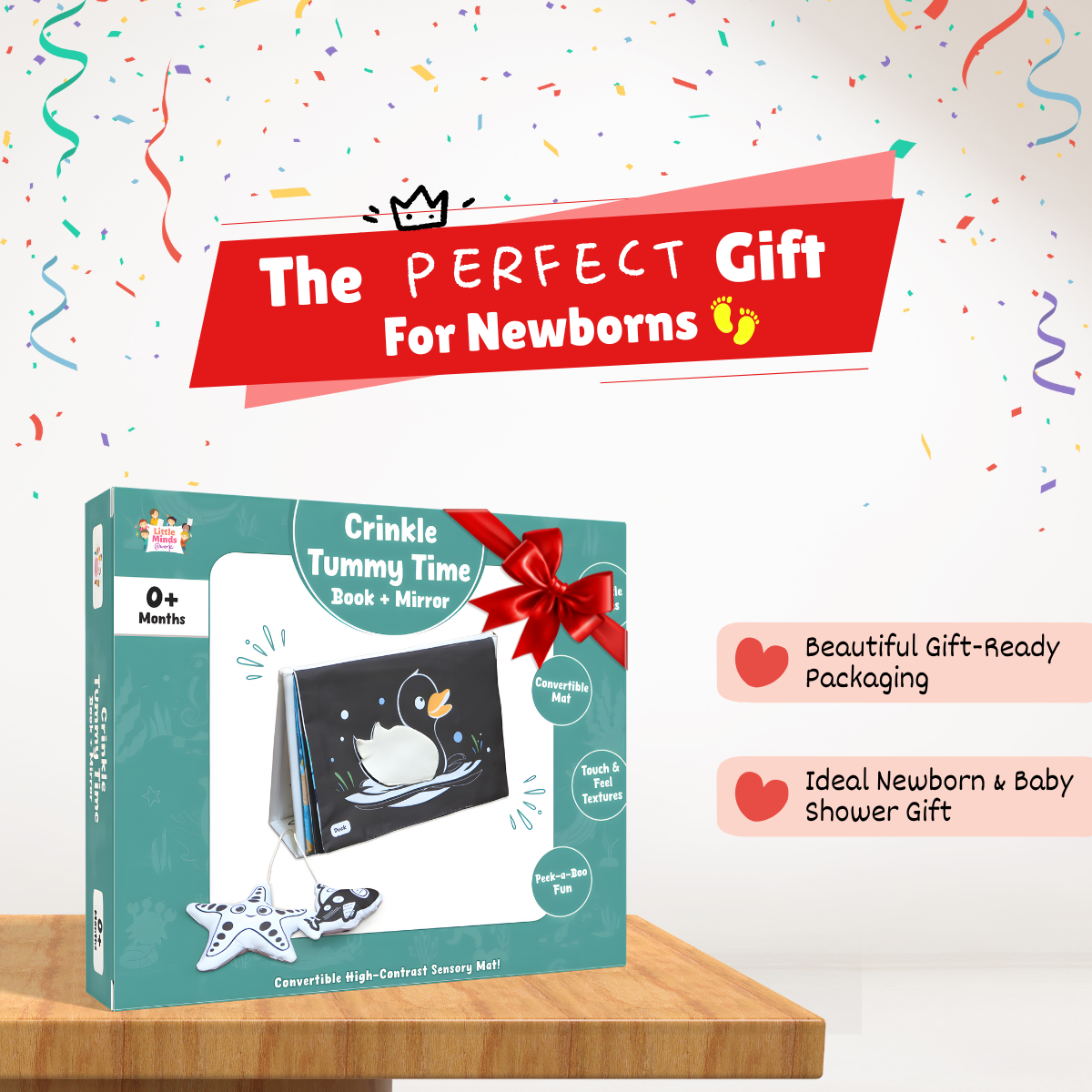 - Crinkle book + convertible tummy time mat